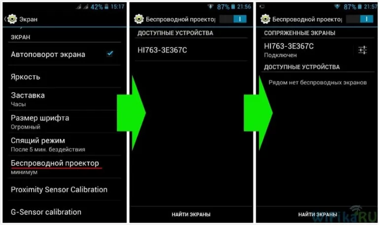 - На смартфоне заходим в Настройки > подменю «Беспроводной проектор», выбираем сопряженный экран (он будет один в списке).